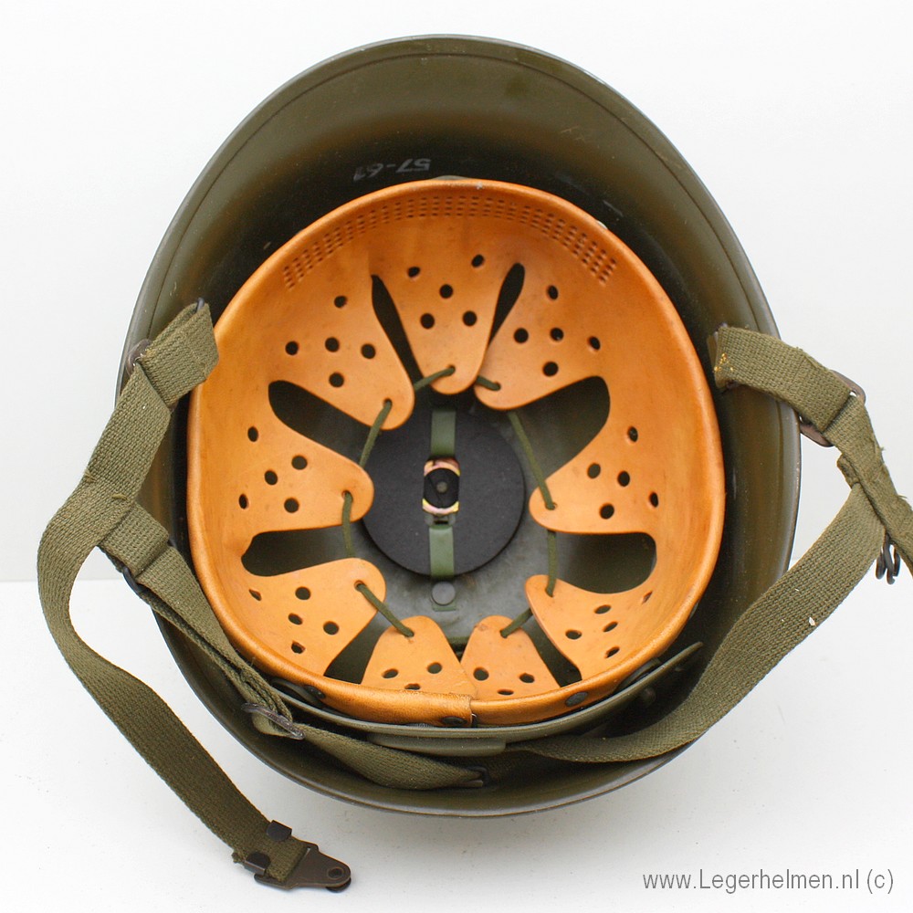 Uit het verre België kwam deze helm binnengevlogen. Duitse M60 1A1. In de jaren vijftig van de vorige eeuw wilde het Duitse leger een nieuwe helm. Terug naar de M35 werd als niet smaakvol gezien en dus kwam er een op de M1 lijkend model. Maar wel zonder losse liner. Liner is een plastic schaal waar alles op gemonteerd werd. Zit met een centrale moer bovenop vast. Zijn een aantal variaties op te vinden.