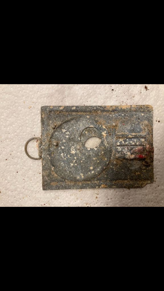 Ook uit het Duitse putje: een plaatje met een draaibare schijf en schuif. Met hangertje zonder merk / logo.