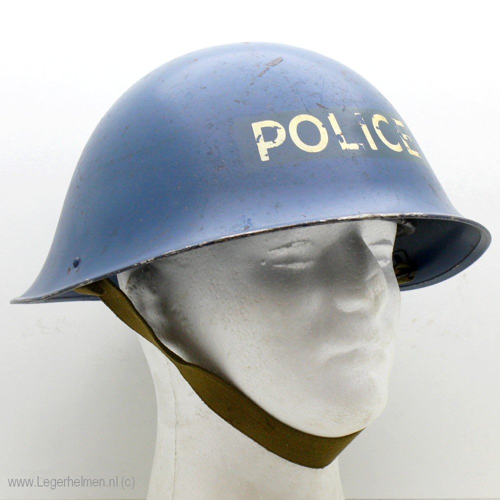 In de jaren vijftig begon het er op te lijken dat een conflict met de oosterburen in Rusland niet ver meer was. Als voorbereiding werd uit de oude legervoorraden alvast nieuwe helmen gemaakt voor een politiemacht in geval van een conflict. Stemmig blauw gespoten om duidelijk te maken wie bij de politie was. Ook stond dat duidelijk op de voorkant van de helm. Ze zijn waarschijnlijk nooit uit de opslag gekomen maar vertegenwoordigen toch weer een stukje geschiedenis van net na de tweede wereldoorlog. De modellen en voeringen zijn soms verschillend zo heb ik een zwarte (Engels) en bruine (België) in mijn verzameling. Niet zo spannend als een verroeste helm met battle-schade maar toch verzamelbaar.
