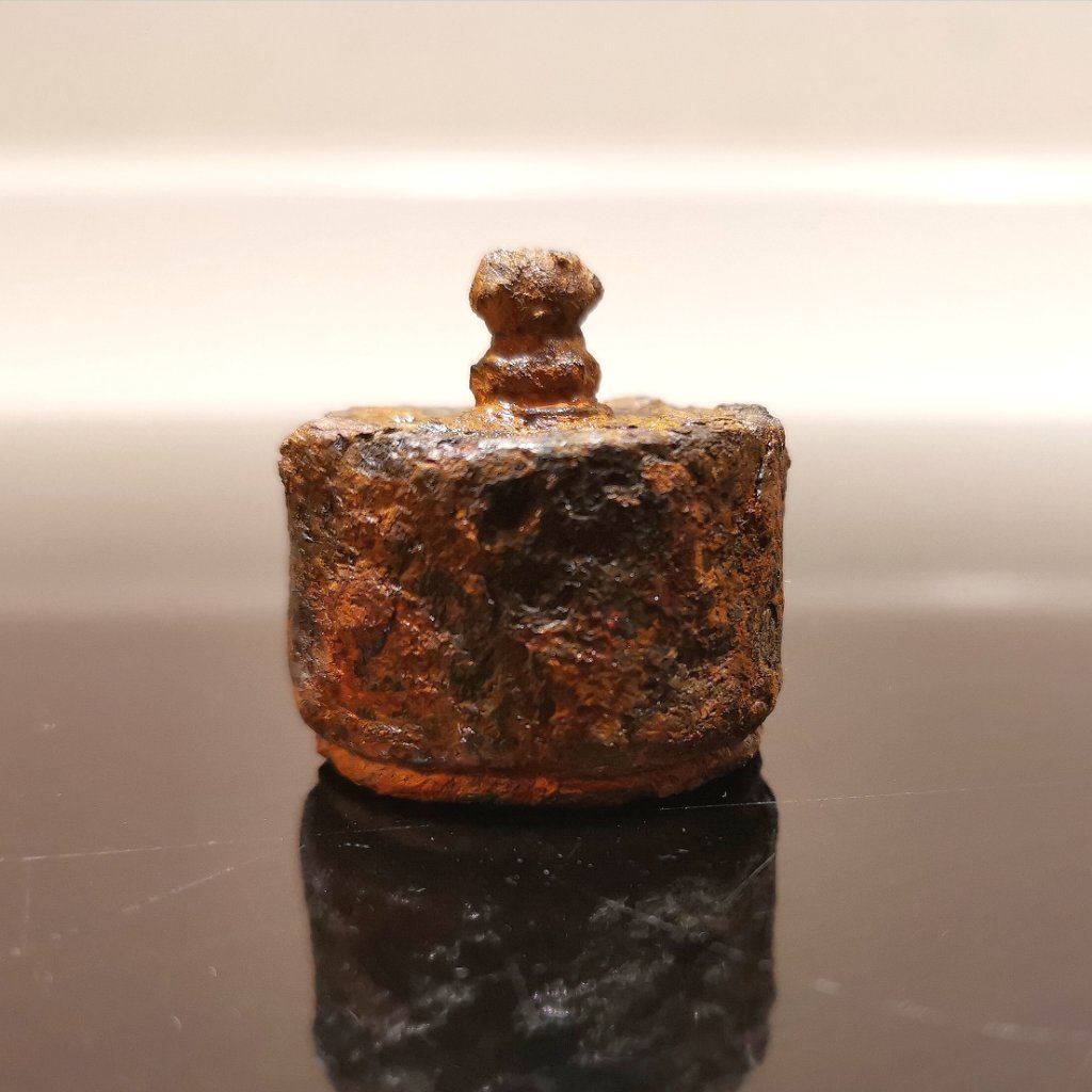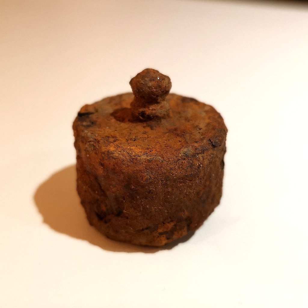 Ik kan je niet zeggen wat het is, ik weet alleen dat gewichtjes een kleine uitholling hebben waar lood in kan voor het ijken. Dit object heeft een groot gat aan de onderkant, en is daardoor geen gewicht, ik ben zelf ook benieuwd naar wat het dan wel is.......
