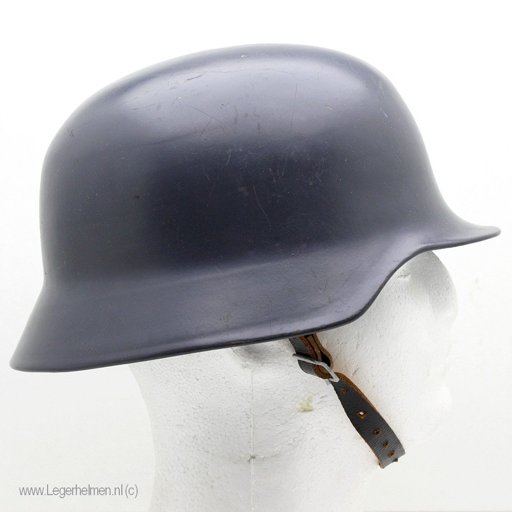 In de jaren vijftig begon het er op te lijken dat een conflict met de oosterburen in Rusland niet ver meer was. Als voorbereiding werd uit de oude legervoorraden alvast nieuwe helmen gemaakt voor een politiemacht in geval van een conflict. Stemmig blauw gespoten om duidelijk te maken wie bij de politie was. Ook stond dat duidelijk op de voorkant van de helm. Ze zijn waarschijnlijk nooit uit de opslag gekomen maar vertegenwoordigen toch weer een stukje geschiedenis van net na de tweede wereldoorlog. De modellen en voeringen zijn soms verschillend zo heb ik een zwarte (Engels) en bruine (België) in mijn verzameling. Niet zo spannend als een verroeste helm met battle-schade maar toch verzamelbaar.