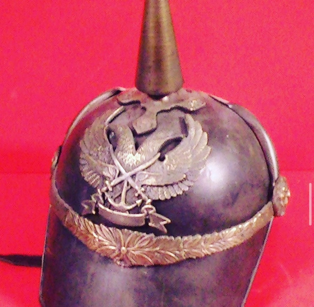 Het hoofddeksel is een oud model Pickelhaube. Midden 19e eeuw, vanaf 1843. Ik heb echt meer fotos nodig van deze Pickelhaube om er iets meer over te kunnen zeggen. Is het überhaupt wel van leer?