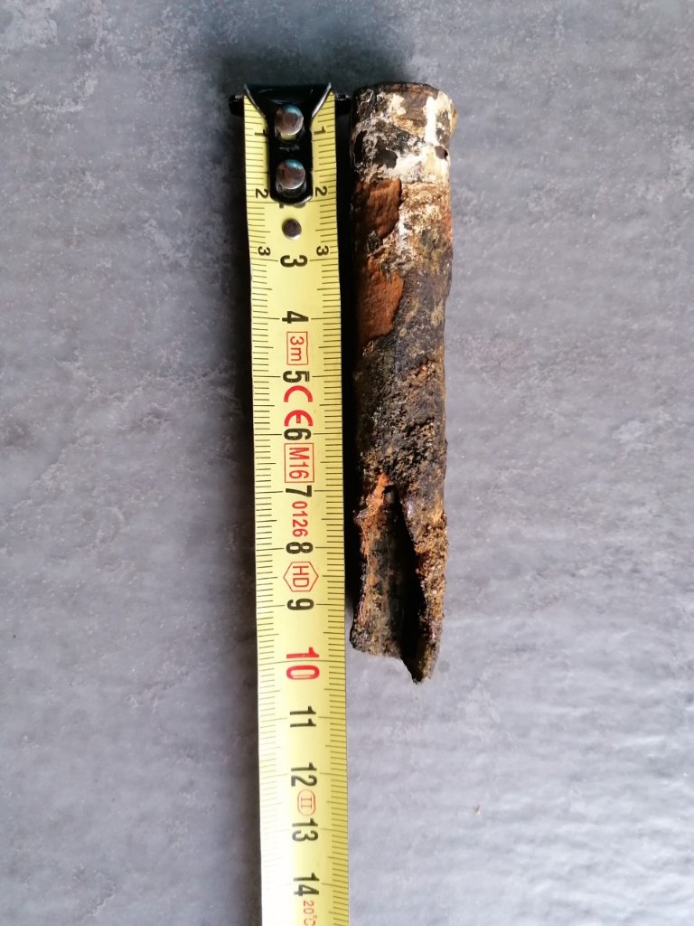 Volgens mij is dit wel een huls. Het gaatje aan de onderkant is waar het slaghoedje heeft gezeten. Door tekorten aan andere metalen werden hulzen, in zowel de 1e als 2e wereldoorlog van andere legeringen gemaakt. Aangezien uw huls te dik lijkt te zijn voor een huls verbaasd het mij niet, dat deze is uitgezet door oxidatie. Gezien de witte oxidatie samen met de rode oxidatie, denk ik dat dit waarschijnlijk een Duitse huls is van na 1944. Door een tekort aan bepaalde materialen om messing te maken, maakte de Duitsers vanaf 1944 ook hulzen van een zink en staal legering. Het zou hier goed kunnen gaan om een Duitse huls. De Amerikanen deden het zelfde, door het zelfde probleem. Omdat de bodemstempel niet meer zichtbaar is en de huls door de tands des tijds nogal wat schade heeft opgelopen, zou ik u niet kunnen zeggen voor welk wapen deze werd gebruikt. Door het gebruik van legering (te zien aan de oxidatie). Durf ik wel te beweren dat dit om een huls gaat uit de tweede wereldoorlog.