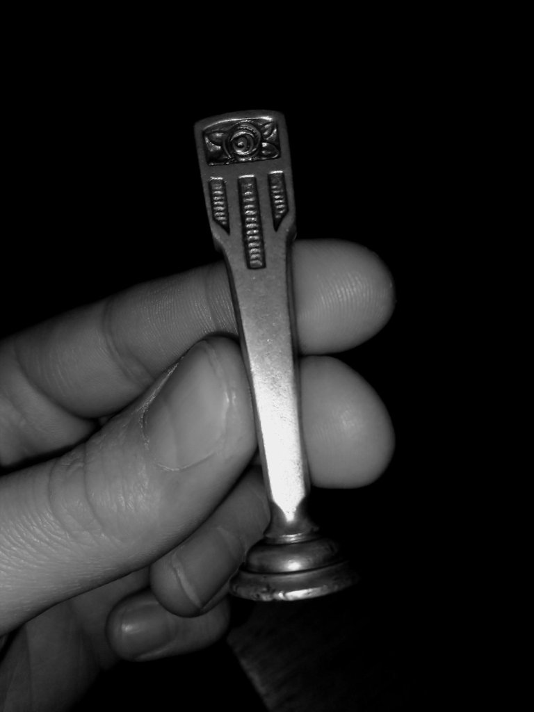 Dit is gevonden in Groesbeek. in de buurt van de Wolfsberg. Wie herkend zo'n item? Het vermoeden is dat het een persoonlijke stempel van Duitse (officier?) is. Ik ben heel benieuwd of iemand mij meer informatie kan geven. Ik heb geprobeerd te achterhalen welk logo het is, maar ondanks dat ik met kleuren heb bewerkt, erg lastig.