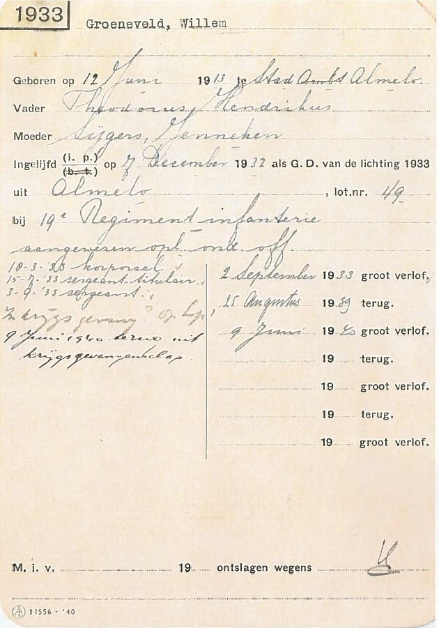 Het uniform van Sergeant-menagemeester Willem Groeneveld uit Almelo. Tijdens de mobilisatie van 1939-1940 ingedeeld bij het MC-III-19e Regiment Infanterie. Wat gelegerd was bij de Grebbeberg. Daar is hij gewond geraakt en later als krijgsgevangene afgevoerd naar Duistland. En komt op 9 juni weer terug naar Nederland. Het toeval wil dat zowel mijn opa bij het 19e Regiment Infanterie was ingedeeld (vanaf 27 maart 1940 bij het 3-II-11e R.I.) als mijn oud oom MC-II-19e R.I. 2e stuk, en de opa van mijn vriendin staf-19e R.I. en ook bij zaten en ook alle 3 uit Almelo kwamen.