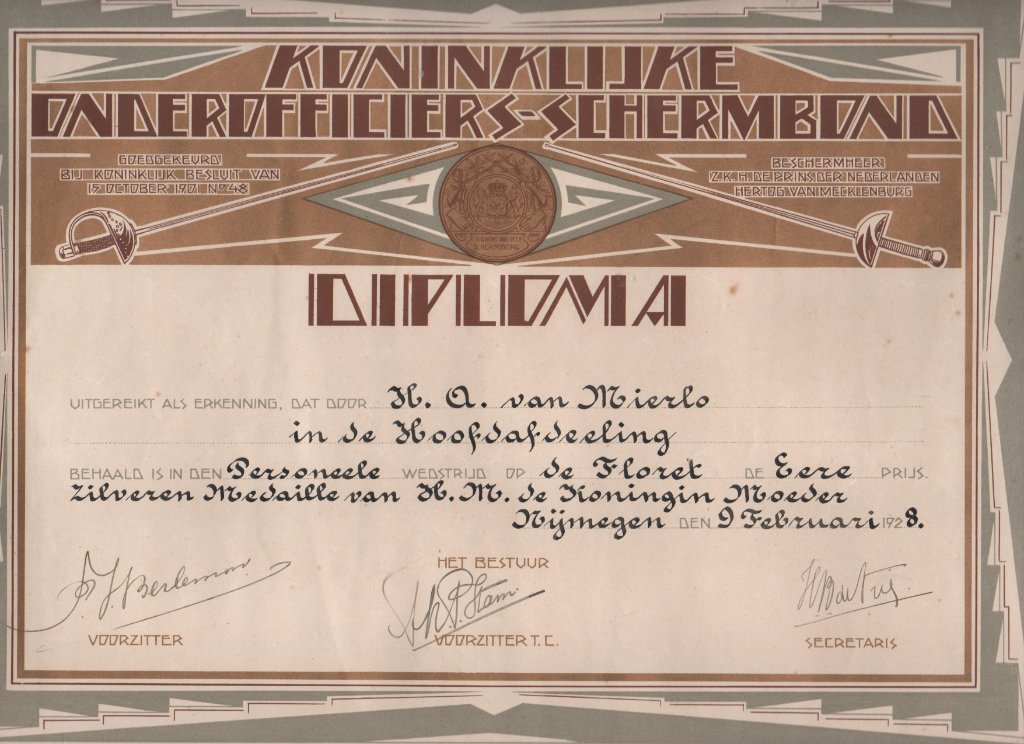 De wisselbeker van de Koninklijken Onderofficiers-Schermbond. Als men deze 2 keer won mocht je hem houden en dat deed hij in 1928 en in 1930. Het diploma uit 1928, 1930 en een telegram namens overste van Reede, directeur der Rijschool, en de krantenartikellen zitten er ook bij. Ook leuk in een van zijn brieven naar zijn ouders schrijft George Maduro dat hij gymnastiek krijgt van den professional sabel schermkampioen van Nederland wachtmeester van Mierlo.