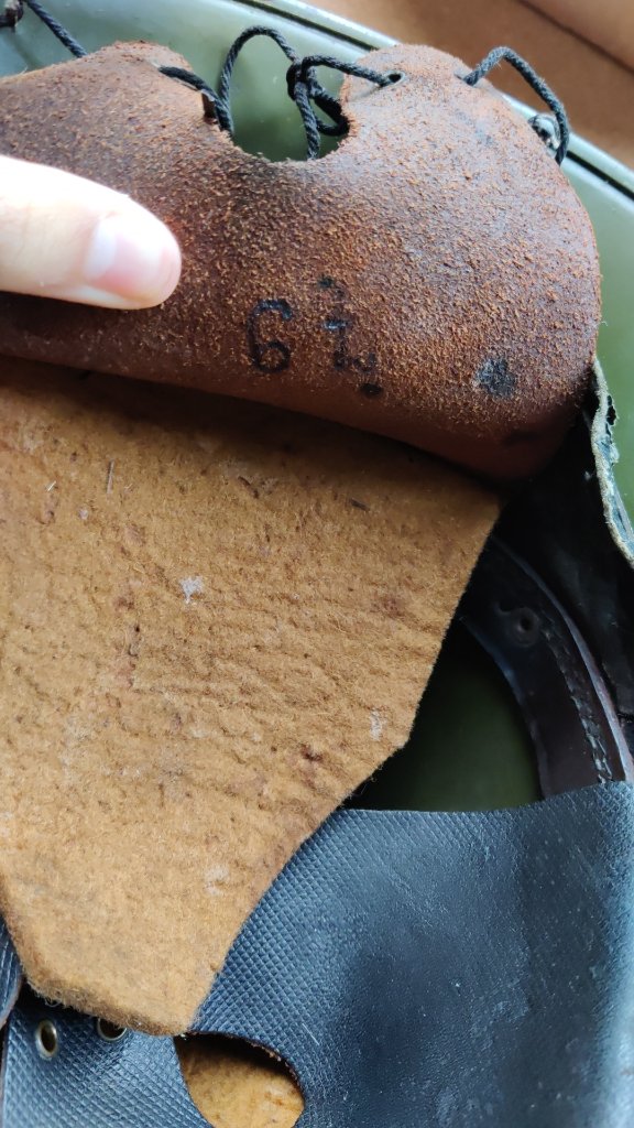 Deze maand twee nieuwe helmen aan de collectie toe kunnen voegen! de eerste is jammer genoeg niet zichtbaar CM gemarkeerd, gezien het binnenwerk het aardig te verduren heeft gehad door de jaren heen. Wel deze, voor mij, mysterieuze markering in de achterse van de drie flappen gevonden: 6.f(?)