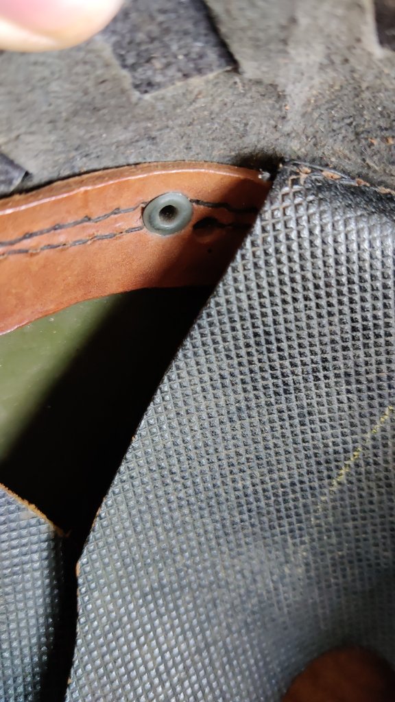 Deze maand twee nieuwe helmen aan de collectie toe kunnen voegen! de eerste is jammer genoeg niet zichtbaar CM gemarkeerd, gezien het binnenwerk het aardig te verduren heeft gehad door de jaren heen. Wel deze, voor mij, mysterieuze markering in de achterse van de drie flappen gevonden: 6.f(?)