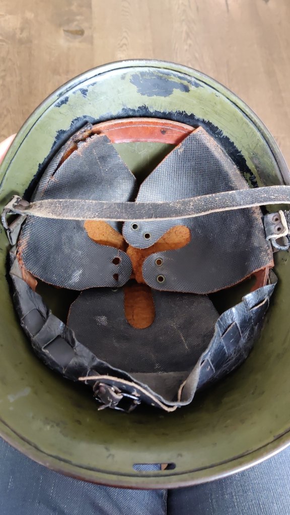 Daarnaast ook voor iets meer dan 150 deze mooie m33(?) verkregen! na de oorlog is de zwarte laag waarin de helm ooit is overgeschilderd, er weer grotendeels afgehaald, maar hier en daar is nog wat zichtbaar. Verder lijkt er heel vaag nog een blauwe stempel onder een van de flappen te zitten, en is de kinriem nog op volle lengte! ook staat de naam "Van Os" tweemaal in de helmschaal net onder het binnenwerk.