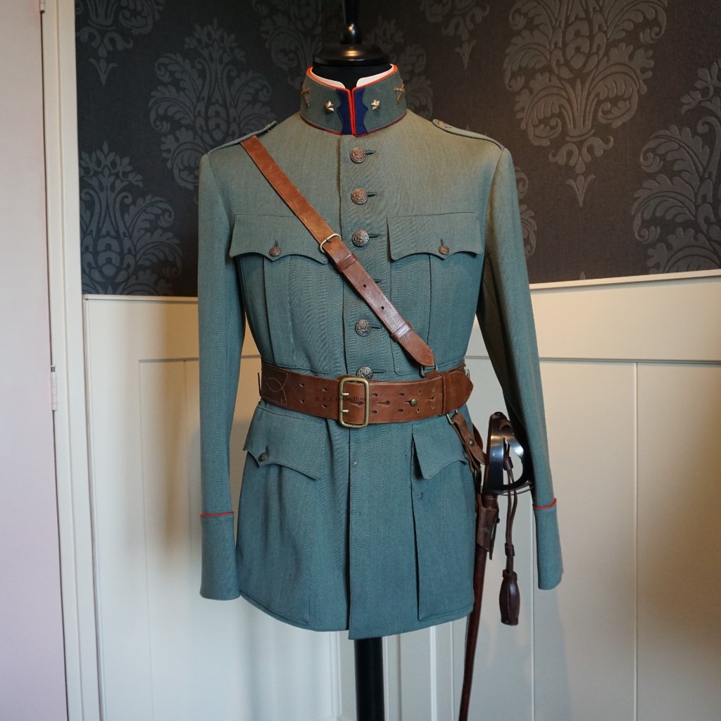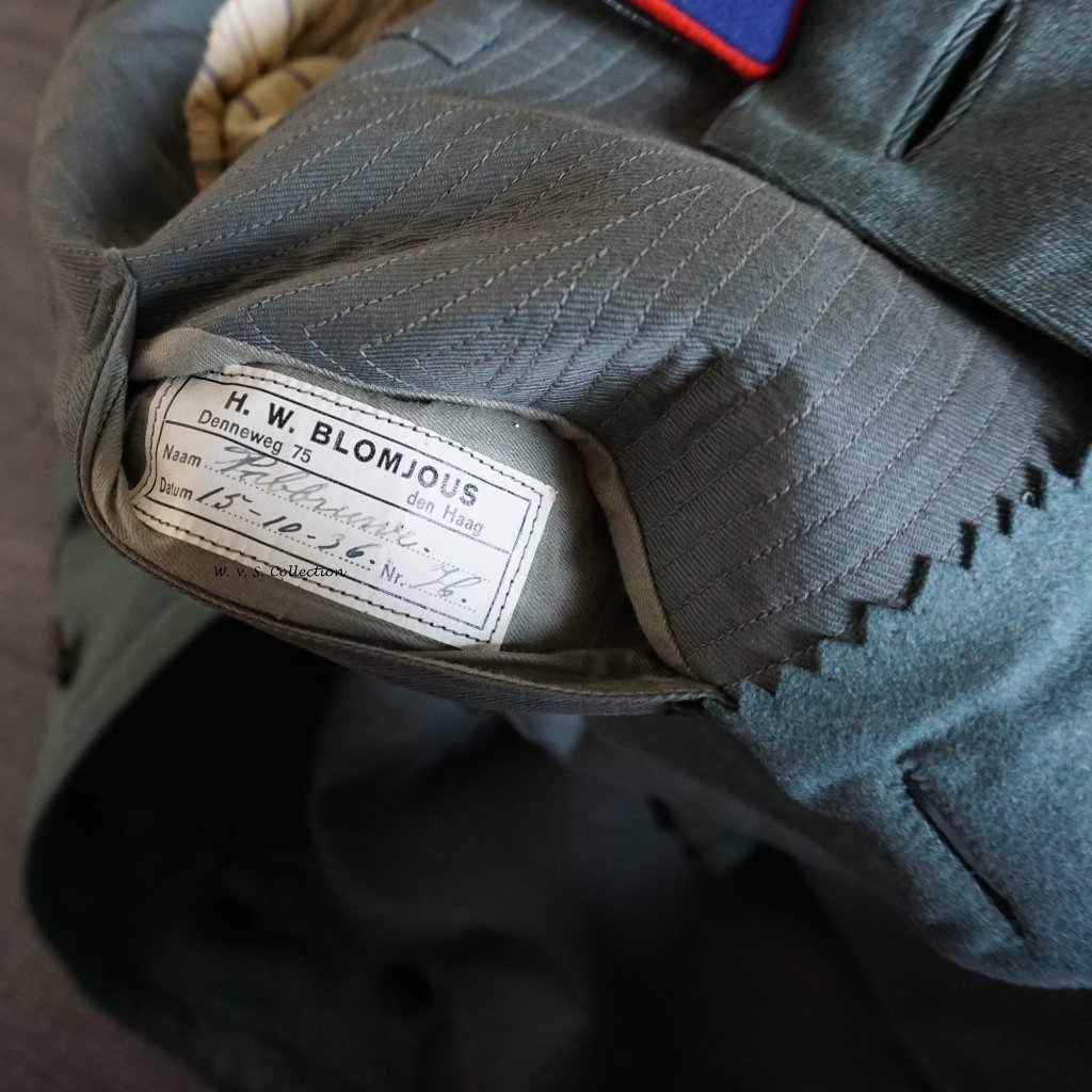 Neemt niet weg dat er toch iets te melden valt. Ik heb al een enkel jaartje een jas in mijn bezit, welke na het doorspitten van mijn eigen draadje, nooit echt onder de aandacht is gekomen. Waarschijnlijk is ie wel een keer op een groepsfoto voorbij gekomen. Het betreft een buitenmodel jas van een (reserve)officier voor speciale diensten der Artillerie. Te herkennen aan de blauwe vilten kraagstukken. De zogenaamde "vlaggen". De jas is op naam van ene heer Pabbruwe. Helaas niets over deze persoon kunnen vinden. In ieder geval was hij 2e (res.) luitenant in Oktober 1936 zoals op het label is af te lezen. De jas komt uit het kleding atelier van de fa. H.W. Blomjous uit den Haag.