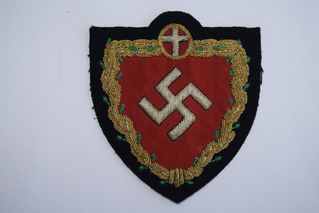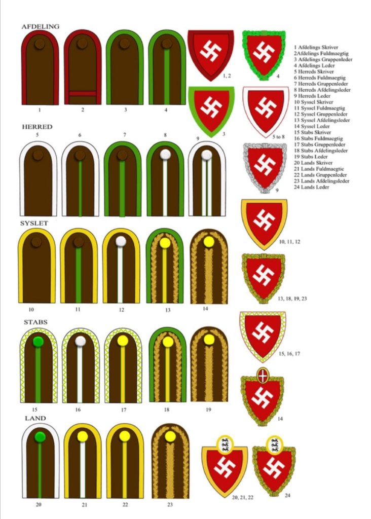 Misschien een late reactie, maar dit is een embleem voor de rang van Syssel Leder binnen de DNSAP. Dit was de Deense Nationaalsocialistische Arbeiderspartij. In het embleem zijn ook de kleuren van de Deense vlag terug te zien, namelijk rood en wit. Onderstaand ook nog een lijst met de emblemen en de rang erbij. Ook heb ik nog een foto toegevoegd van DNSAP leden in uniform waar je ook duidelijk het embleem op de arm ziet zitten.