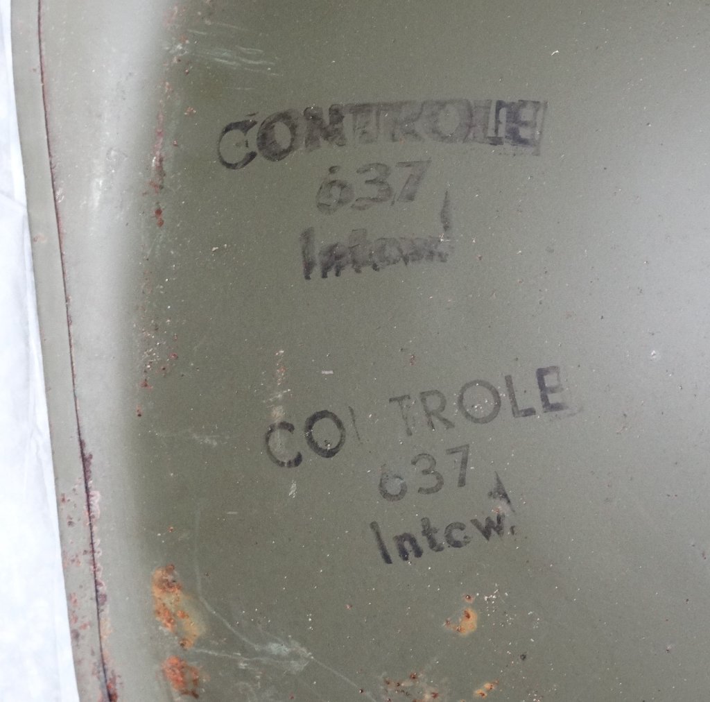 De stempel 637 Intcw staat voor 637e Intendance Centrale Werkplaats in Woerden. Op deze werkplaats werden destijds de retour gekomen (groene) plunjezakken nagekeken. M53 helmen die beschadigd waren werden daar hersteld. Goedgekeurde helmen kregen zo'n zwarte controle stempel. Meestal werd deze stempel er dan drie of vier keer ingezet.