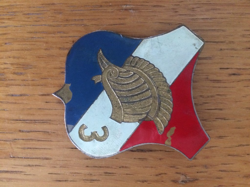 Zie bijlage, de draagspeld rood, wit en blauw met helm en genummerd 3 is 5 cm hoog.