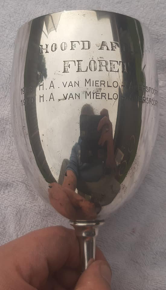 De wisselbeker van de Koninklijken Onderofficiers-Schermbond. Als men deze 2 keer won mocht je hem houden en dat deed hij in 1928 en in 1930. Het diploma uit 1928, 1930 en een telegram namens overste van Reede, directeur der Rijschool, en de krantenartikellen zitten er ook bij. Ook leuk in een van zijn brieven naar zijn ouders schrijft George Maduro dat hij gymnastiek krijgt van den professional sabel schermkampioen van Nederland wachtmeester van Mierlo.