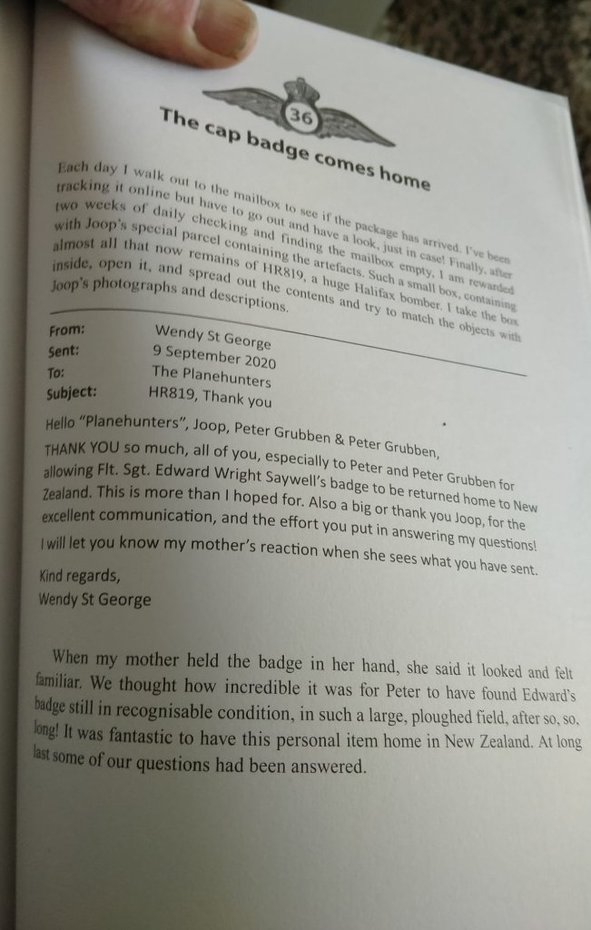 Prachtig verhaal, en heel mooi om te lezen hoe jullie de geschiedenis van de piloot Edward Saywel sluitend hebben kunnen maken voor de familie van hem, nu, al zo lange tijd na zijn verdwijning!