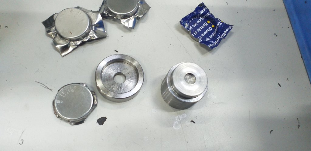 Op het werk in minuten dat mijn machine liep aan een pers malletje voor de kapjes gemaakt een malletje voor de buiten maat en een voor de binnenmaat. Uit een leeg WD40 spuitbus heb ik plaatjes geknipt. Deze tussen de malletjes gedaan en in een bankschroef ineen geperst.