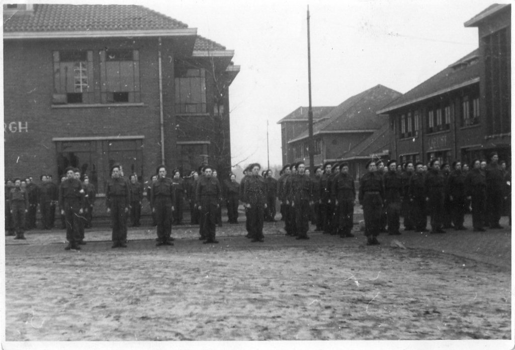 Uitgaande van de uniformering van de soldaten op de foto, denk ik niet dat het om een groep naoorlogse dienstplichtige soldaten gaat. Helaas is de foto niet al te groot, maar de rangen en emblemen op de uniformen en de baretten doen mij vermoeden dat het soldaten zijn van de Koninklijke Nederlandse Brigade Prinses Irene; https://nl.wikipedia.org/wiki/Prinses_Irene_Brigade en http://www.prinsesirenebrigade.nl/index.html .