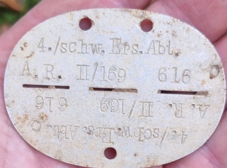Als ik mij niet vergis dan is deze erkenungsmarke van iemand van de: Scheinwerfer Ersatz Abteilung Artillerie Regiment 2/169 geweest. Waar de 4. In het begin en de 616 voor staan aan het einde weet ik niet.