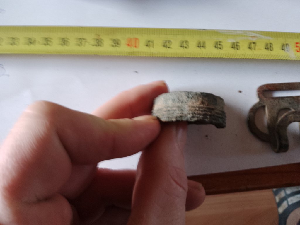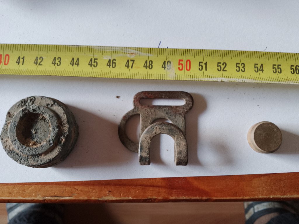 Het middelste object is inderdaad een fournituur (gesp) van een zg. Britse/Canadese Pattern-37 L-strap. Deze L-strap was nodig om de haversack (ransel) aan de webbing P-37 uitrusting te bevestigen, zie; http://josephs-militaria-and-homefront- ... AGE45.HTML