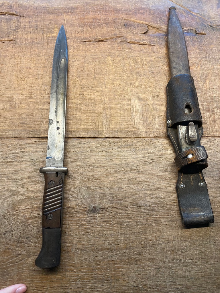 De laatste is een Duitse Mauser K-98 bajonet, niet nummergelijk zo te zien maar nog steeds een mooi geheel.