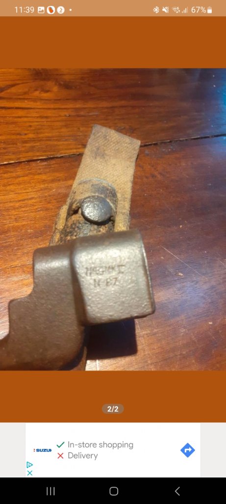 Het merktekentje wat nog gedeeltelijk aanwezig is op de keel van de schede is van de fabrikant Mazak.asjemenou schreef: 10 jun 2023, 18:08 De oorspronkelijke inscripties op de keel van de schede zijn er afgeslepen maar bij het rode pijltje is nog gedeeltelijk een logo van Sheffield Steel Products te zien; https://worldbayonets.com/Bayonet_Ident ... ssp-1.html