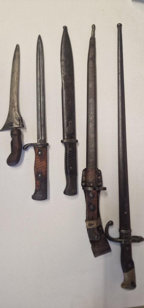 de laatste bajonet is een Frans bajonet voor het M1874 Gras geweer. Als ik het goed heb dan is dit bajonet doorgebruikt door het Belgische leger gedurende WOI. Het werd gebruikt op het Mauser 1889 geweer. Meer daarover kun je hier lezen; http://www.abbl1940.be/ABBL1940files/Wa ... GrasNL.htm