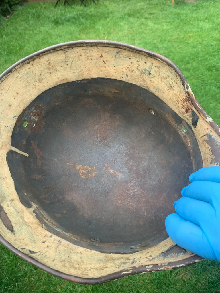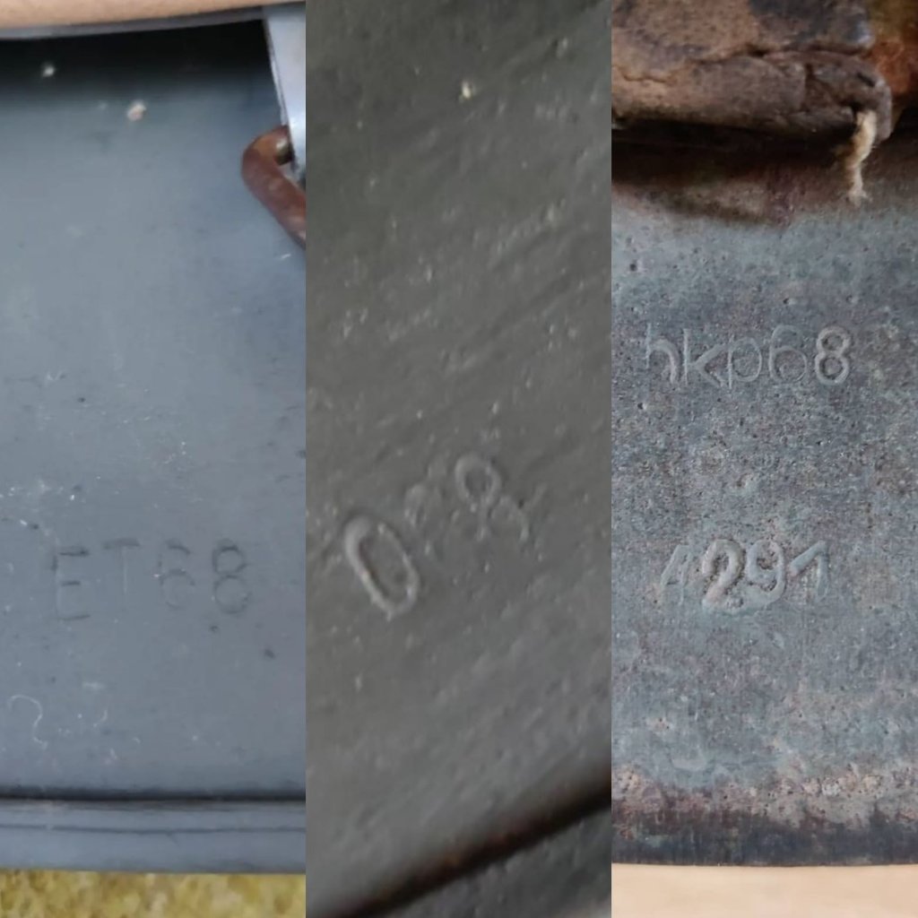 Maar degene die je net toegevoegd hebt, vind ik een twijfelgeval om op te knappen, die ziet er nog strak uit, mooi! Zo te zien had hij al ooit een zand camo gekregen na de oorlog, dat maakt de beslissing natuurlijk makkelijker. De binnenrand werd nooit gedaan bij camo washes in het veld en de druiper (verf) was niet voorbij de ring van de binnenhelm gekomen als hij origineel was.