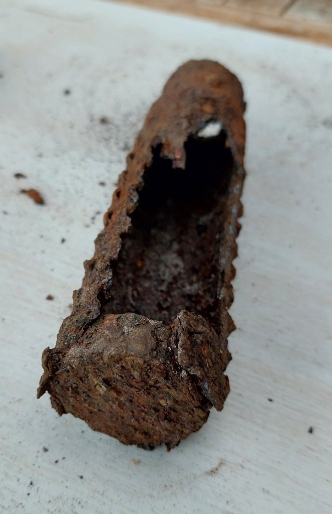 Hallo, ik heb een ijzeren huls gevonden (in slechte staat) met allemaal 'gaatjes' erin. Ik vind op dit forum & internet wel iets terug van een anti terugslag huls, maar daar zijn de gaatjes allemaal rond.