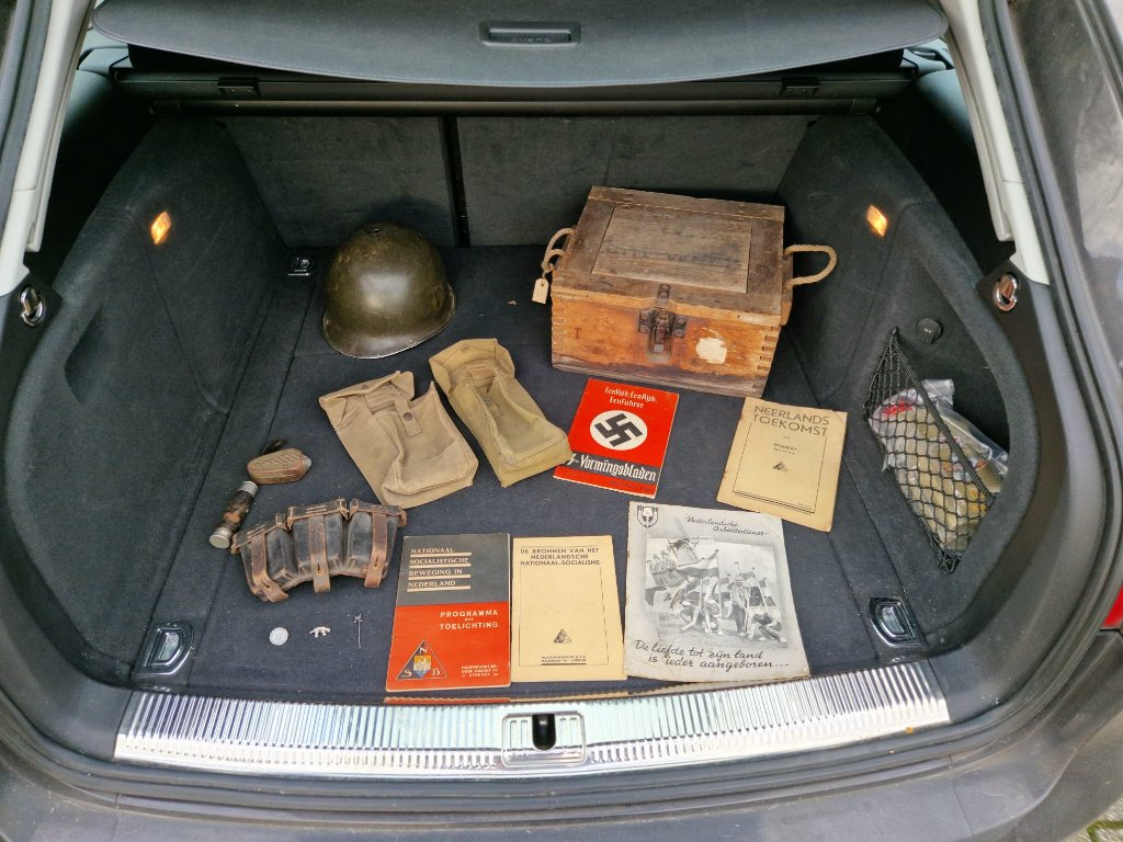 Mijn aanwisten van de afgelopen Koningsdagrommelmarkten zijn een paar M1943 Jungle Boots 'Made in Czechoslovakia' door Cebo in waarschijnlijk de jaren '60, zo te zien vrijwel een 1-op-1 kopie van de originele Amerikaanse. Mijn maat, vrijwel ongedragen en prima bruikbaar voor re-enactment. Ook nog een pre-1940 Nederlands holster met afwijkende (originele) draaglussen die ik nog niet heb kunnen plaatsen, en een blikken Schuco autootje uit de jaren '50. Het holster heeft helaas geen leesbaar stempel meer.