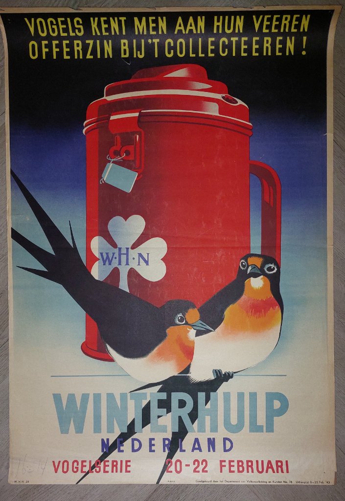 Winterhulp poster 'Vogels kent men aan hun veeren, offerzin bij't collecteeren! 20-22 Februari 1943.