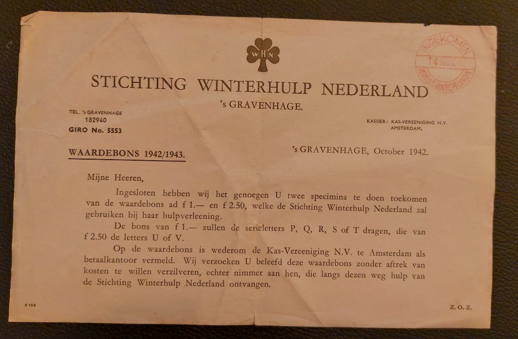 ‐----------------------------------------------------------------------------------------------- Winterhulp waardebon 1 gulden 1943/1944 voor de gemeente Rucphen