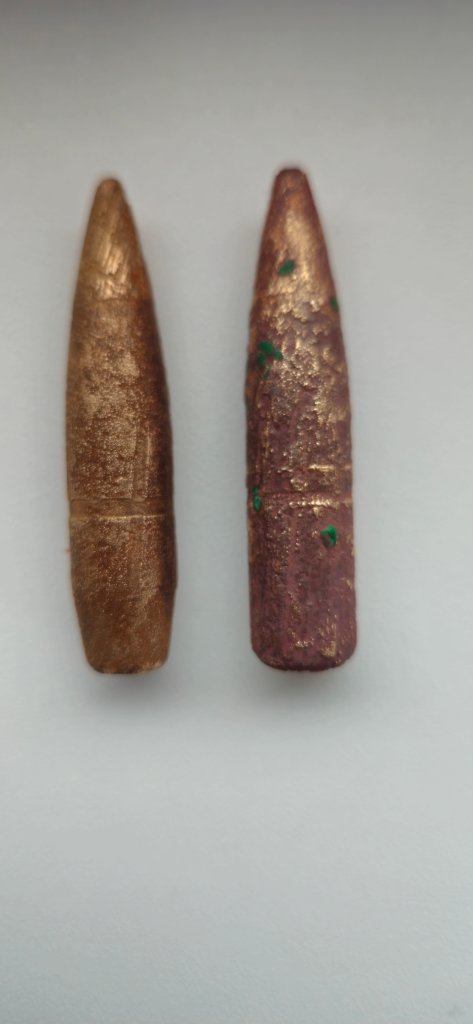 De linkse is 5,8cm lang met onderaan diameter van 0,8cm. Hier waren sporen van zwart op de top, verloren gegaan met proper te maken..