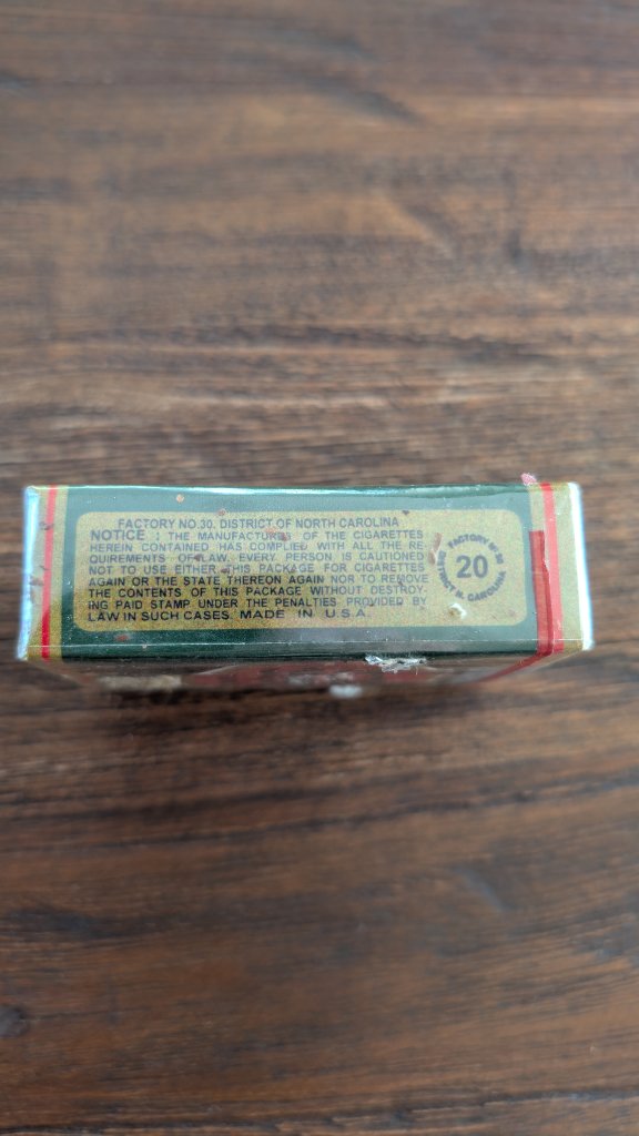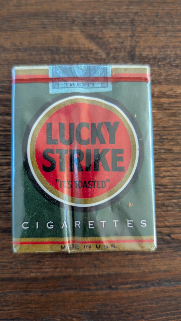 De verkoper had een enorme collectie van oude sigaretten. Volgens hem was dit een origineel leeg pakje green lucky strike. (Zou opgevuld en resealed zijn. (Door een gaatje in het pakje kan ik zien dat het is opgevuld met plastic rietjes.) Ik heb voor ik het aankocht wat research gedaan, maar het blijft voor mij onduidelijk als het hier om een echt pakje gaat of een fake. Wie kan mij hierbij helpen?