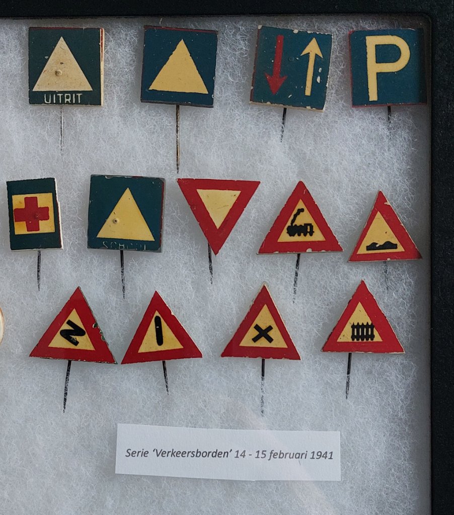 een bijdrage in de collectebus kreeg men een speldje in de vorm van een verkeersbord.