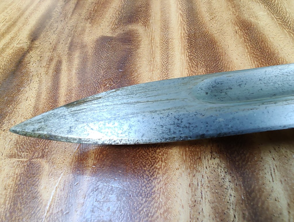 Nu had ik twee vragen. Wat is de waarde van deze Bajonet? Heb hem zeker twintig jaar geleden eens overgenomen van een verzamelaar die er mee stopte maar geen idee wat ik er destijds voor betaald heb. En is het raadzaam om hem eens te poetsen (ontroesten) of is het beter dat juist niet te doen? Op zich herinner ik me wel dat de staat overeenkomt dus de roestige waas heeft er altijd al op gezeten zo lang ik hem in mijn bezit heb. Alleen het beetje roest is erg licht dus niet diep. Zou er makkelijk af te krijgen moeten zijn.