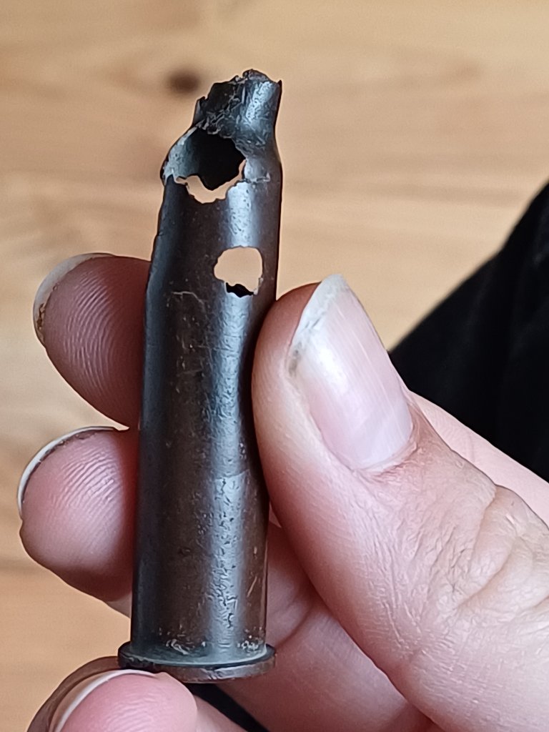 De huls is aan de bovenkant deels vergaan en ongeveer 51mm. De huls is rimmed. En had vermoedelijk een flessenhals. Dit is niet te zien omdat hij bovenaan is weggeroest.