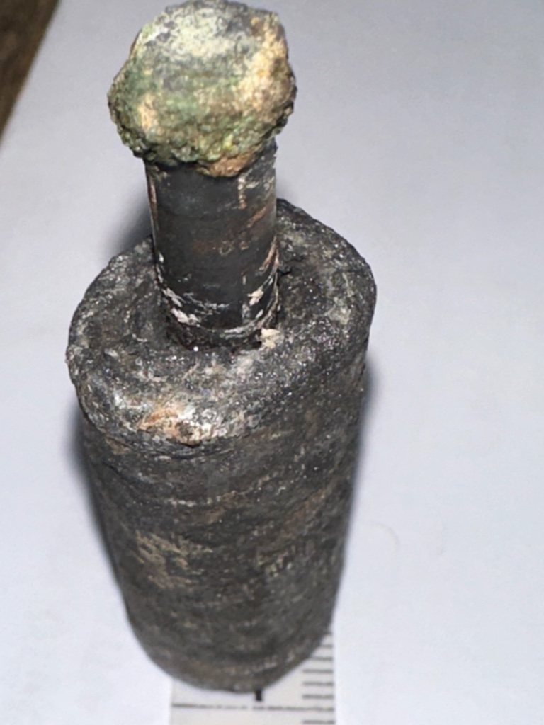 Het object is ongeveer 5,2 cm lang en 1,5 cm dik. Het lijkt op een soort patroon of ontsteker, maar ik twijfel of het niet ook een oud CO₂-patroon zou kunnen zijn. De bovenkant is sterk gecorrodeerd, de onderzijde lijkt op een afgevuurd slaghoedje.