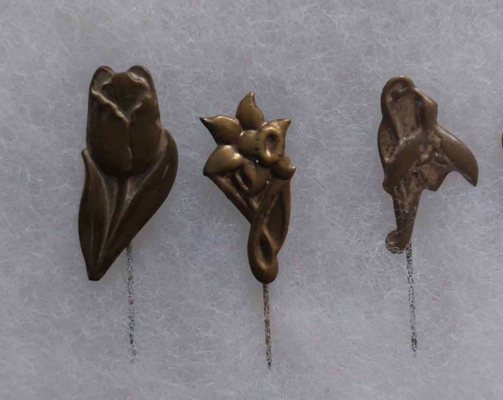 De speldjes bestonden uit een tulp, sneeuwklokje en een narcis. .