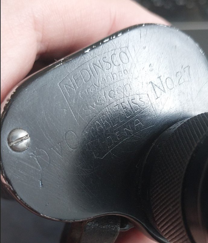 Hartelijk dank voor de informatie. Het karakter van de inscriptie doet mij vermoeden dat deze afwijkt van het gebruikelijke stempel dat ik gewend ben te zien op verrekijkers, bijvoorbeeld op mijn Zeiss Nedinsco van het 4e infanterieregiment (trouwens ook een vraag waar ik tot nu toe geen antwoord op heb – waarom de inscriptie op het prismadeksel DvO niet overeenkomt met het stempel (volgens mij DvD, al kan ik mij vergissen) en de markering op de koker).