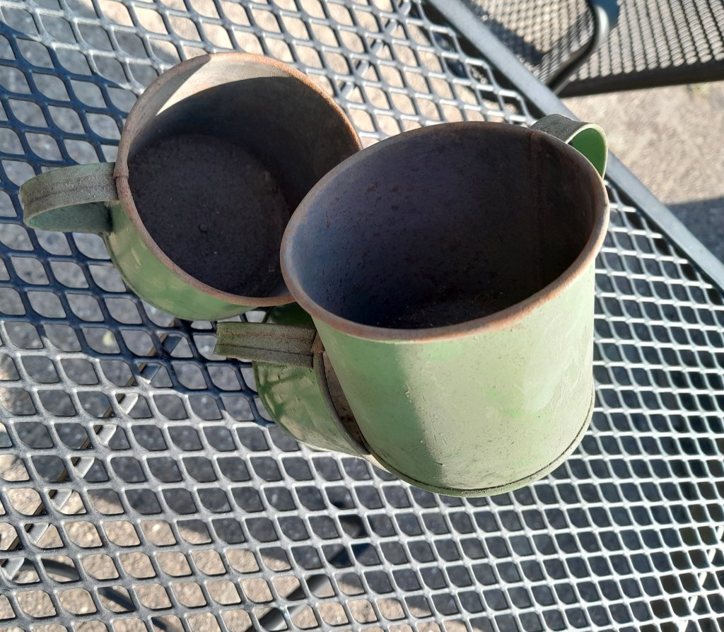 Vanwege schaarste, deze bekertjes gemaakt van Milk Ration tins USA Army..Setje van 3 stuks voor maar 5 euro.,heb een flinke partij kunnen kopen op de rommelmarkt, iedereen liet ze links liggen. Heb nog enkele setjes.