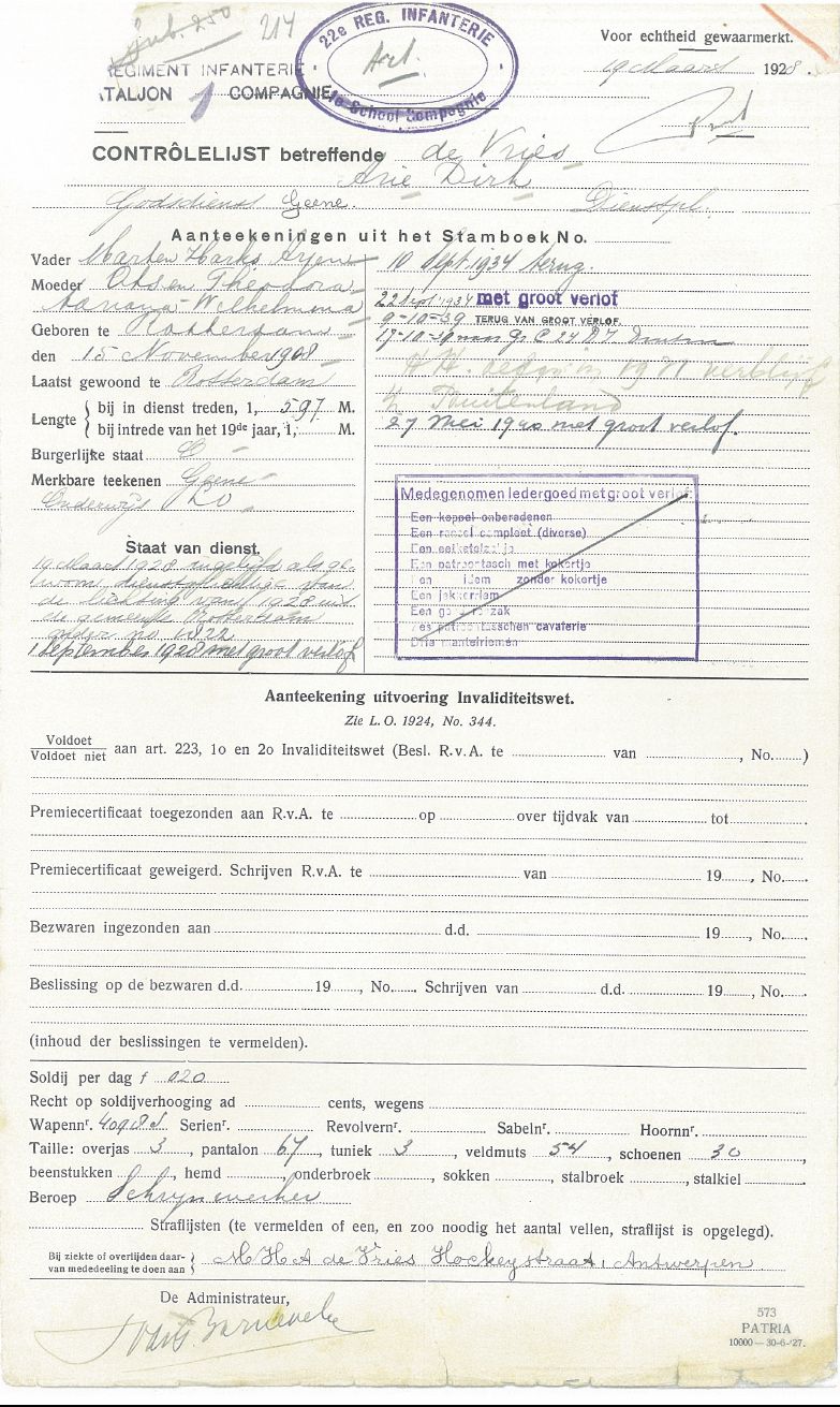 op 19 maart als dienstplichtig soldaat in dienst gegaan bij het 22 R.I