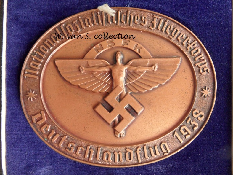 Nog even mbt de zilveren exemplaren. Het moge bekend zijn dat deze plakettes niet alleen zijn uitgegeven voor de Deutschlandflug van 1938, maar ook voor enkele andere vliegevenementen. Zo bestaat er ook een kleinere variant van deze plakettes, met een afmeting van slechts 4,8 bij 6 cm. Voor wie het interesseert: Op Germanwarbooty.com staat een kleine zilveren plaque met zeer laag nummer (13!) voor het 1939 NSFK Reichswettbewerb f. Segelflugmodelle Wassertruppe Rhön. Helaas wel zonder doosje en met wat schade. Het is echter een retezeldzaam item!!!