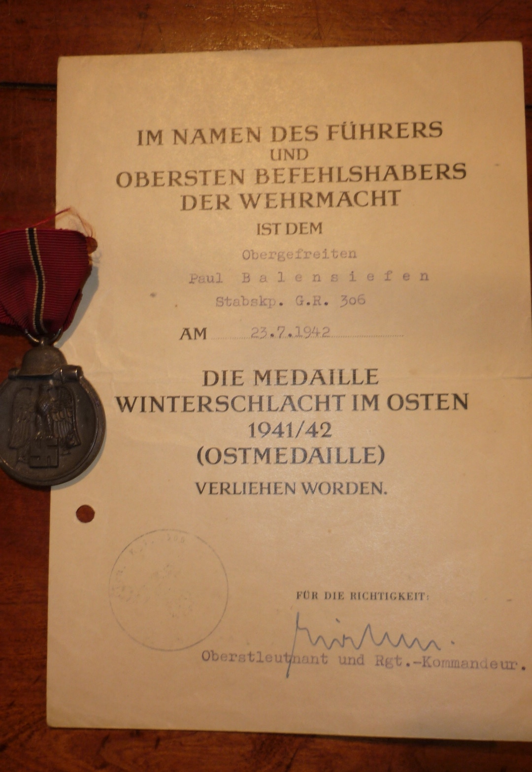 Daarna een Verleihungsurkunde voor het ijzeren kruis 1ste klasse. ondertekend door weer een Eikenloofdrager Johan-Heinrich Eckardt gestorven op 15-05-1945 in Russische krijgsgevangenschap.