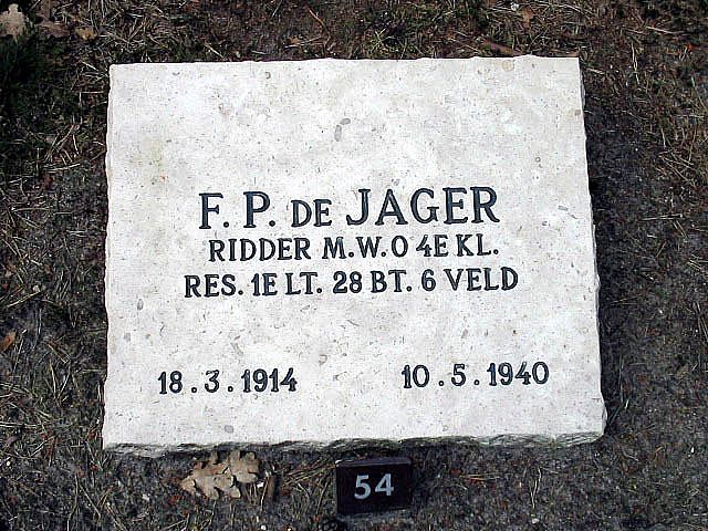 Toen op 10 mei 1940 een paar honderd Duitse parachutisten nabij het dorp Moerdijk afsprongen, ging de luitenant De Jager met zijn beide vuurmonden en vijftien man personeel op weg naar een locatie aan de zuidzijde van het te verdedigen bruggenhoofd. Onderweg werden zij echter belaagd door gelande Duitse parachutisten, zodat de sectie van de luitenant in het min of meer open terrein een opstelling moest kiezen, langs de toenmalige hoofdweg van Moerdijk naar Breda. Tijdens het gevecht dat ontstond bediende de luitenant zelf één van de twee vuurmonden, samen met een soldaat. Toen hij op een zeker moment de vuurmond liet omdraaien om vijand uit een andere richting te bestoken, durfde niemand van de bediening het kanon meer te richten en af te vuren, omdat ze zich daarbij gevaarlijk bloot moesten geven. Na een eerste schot ongericht te hebben afgevuurd besloot de luitenant alsnog goed te richten. Al doende werd hij in het hoofd getroffen en stierf ter plaatse vrijwel meteen aan zijn verwonding. Kort nadien moest zijn sectie zich aan de Duitsers overgeven.