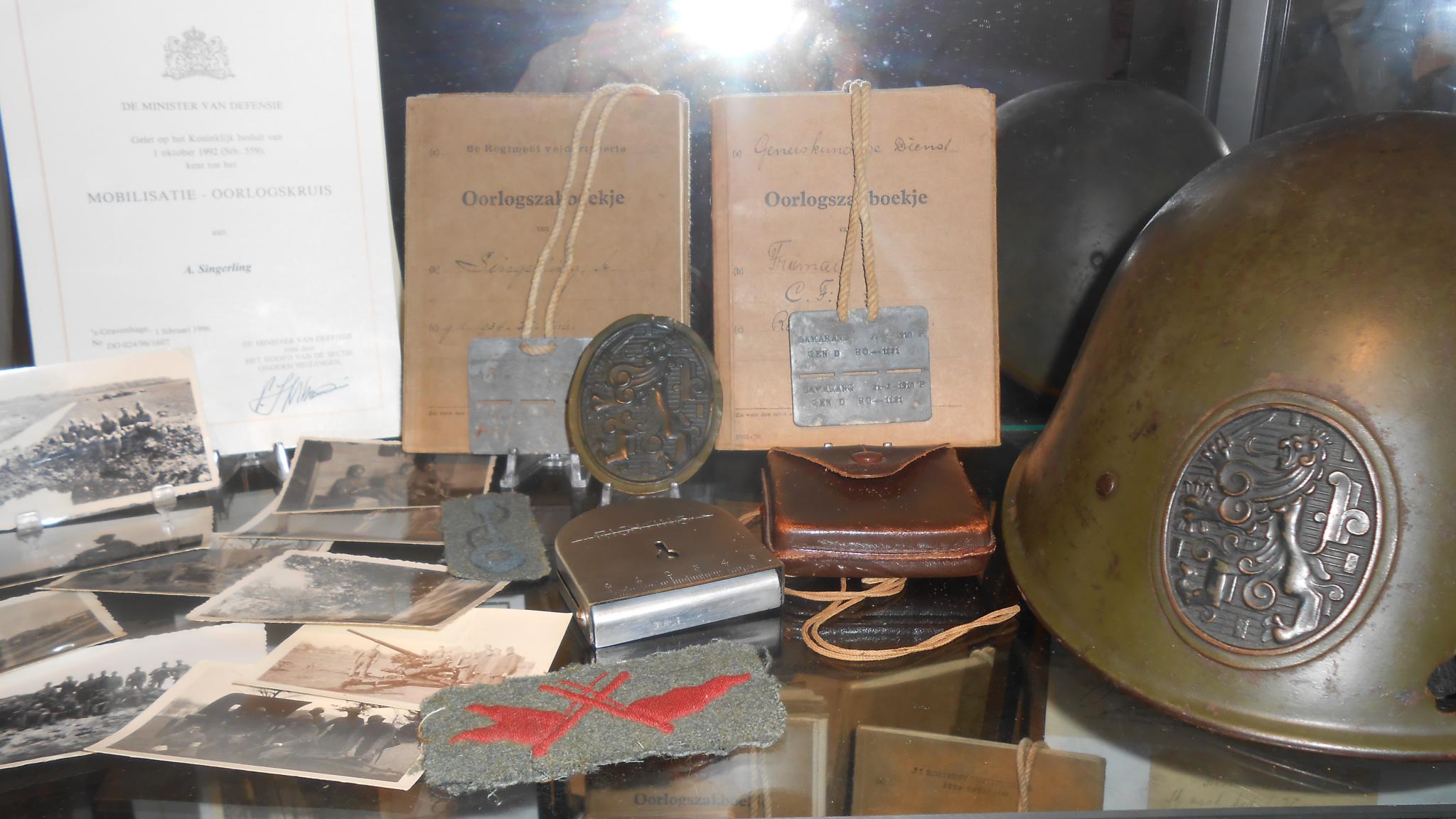 lichtbruine Lewis tas uit 1926, zaklamp (mil. uitgave), herkenningsplaatje en een MHK van dezelfde persoon (direct van de familie), bereden eetketel, officiers veldfles, nog een eetketelfoudraal met eetketel, kompas met tasje van 26 RI, apart kompas van 46 RI met de stempel Beckers & Sons Brummen (eerste keer dat ik deze maker kon kopen), kepie van een Joodse Arts van Gezondheid waarvan de naam bekend is, werkveldmuts in mint staat. Ook nog een militaire veldkijker van de Bleeker Utrecht (zie leger1939-1940.nl voor meer info).
