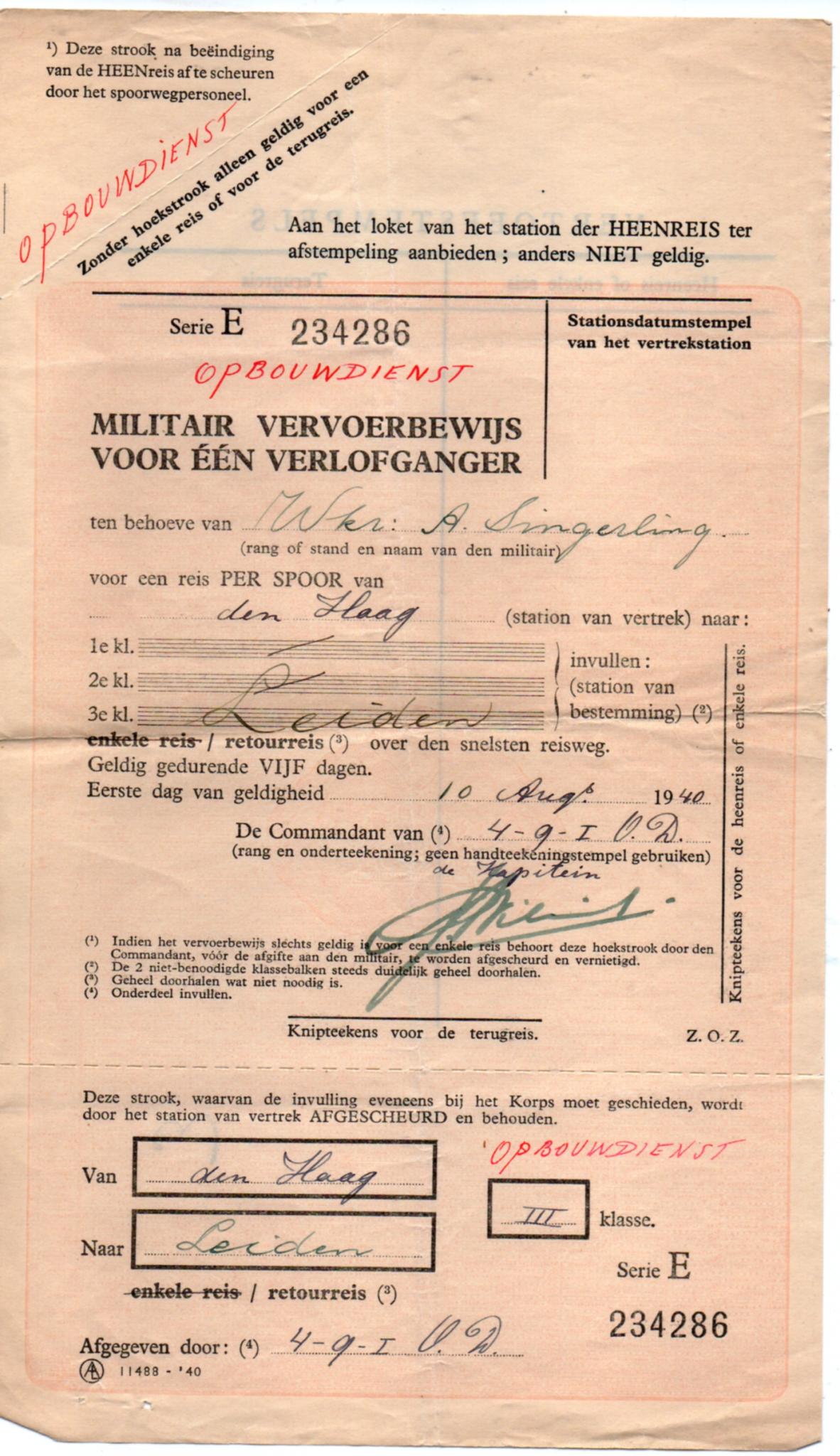 bertjan schreef:Het oorlogszakboekje en herkenningsplaatje, helmplaat , mobilisatiekruis en mouwembleem voor seiner en telefonist van Arie Singerling, geboren 16 oktober 1914 te Leiden. Dienstplichtig soldaat Arie Singerling werd op 15-02-1940 overgeplaatst van het 6 R.A naar het 1e regiment luchtdoelartillerie. Op 7 mei 1940! werd hij geplaatst bij het 78e batterij luchtdoelartillerie. Het 78e luchtdoelartillerie batterij was op 8 mei 1940 op het landgoed bij Duivenvoorde te Voorschoten geplaatst. De munitie sloeg men op in het koetshuis van het kasteel. De woning van de jachtopziener Geitenbeek richtte men in als onderkomen voor de staf. De bemanning sliep, met het bevel van de OLZ: "Verscherpte bewaking binnenland", in twee veldtenten bij de batterij. Toen zij 's ochtends om kwart over drie door het aanzwellend gedreun van vliegtuigmotoren werden gewekt, konden zij direct tot actie overgaan. Van 10 mei tot 14 mei haalden ze 11 vliegtuigen naar benden waaronder het transporttoestel wat neerkwam in de Tweede Adelheidstraat. Te midden van de enorme ravage in de Tweede Adelheidstraat troffen militairen van de Korps Politietroepen Duitse documenten aan in een aktentas bij één van de gesneuvelde bemanningsleden en overhandigde deze aan de reserve luitenant-kolonel H. Ch.E. van Ede van der Pals. Het was direct duidelijk dat de documenten zeer belangrijke informatie bevatte over de Duitse aanvalsplannen. Van Ede van der Pals ging met de kostbare informatie in allerijl naar het Algemeen Hoofdkwartier (AHK) aan het Lange Voorhout en overhandigde daar de buitgemaakte documenten en kaarten aan stafofficieren die de inhoud ervan direct betrokken bij de planning van tegenmaatregelen. Op 14 mei rond 16:20 werd de batterij heftig onder mitrailleurvuur genomen waarna een bombardement volgende van 23 bommen waardoor zoveel schade was dat ze niet meer konden vuren op vijandelijke vliegtuigen.