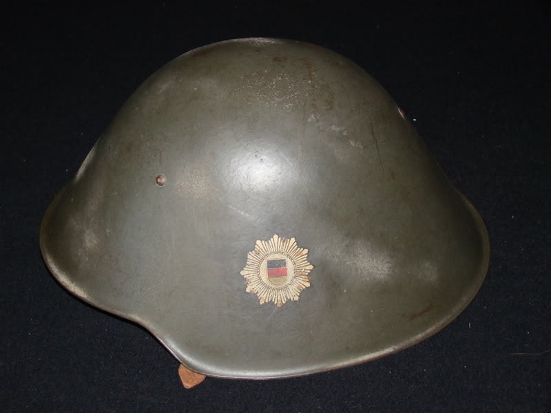 Eenheden van de Volkspolizei droegen tot 1960 een helm met "VP-Stern", zie bijlage uit mijn referentie-database. Ziet er naar uit dat de man op je foto een gelijke helm draagt (ziet er in ieder geval rond uit, niet als het SRG-Staatswappen).