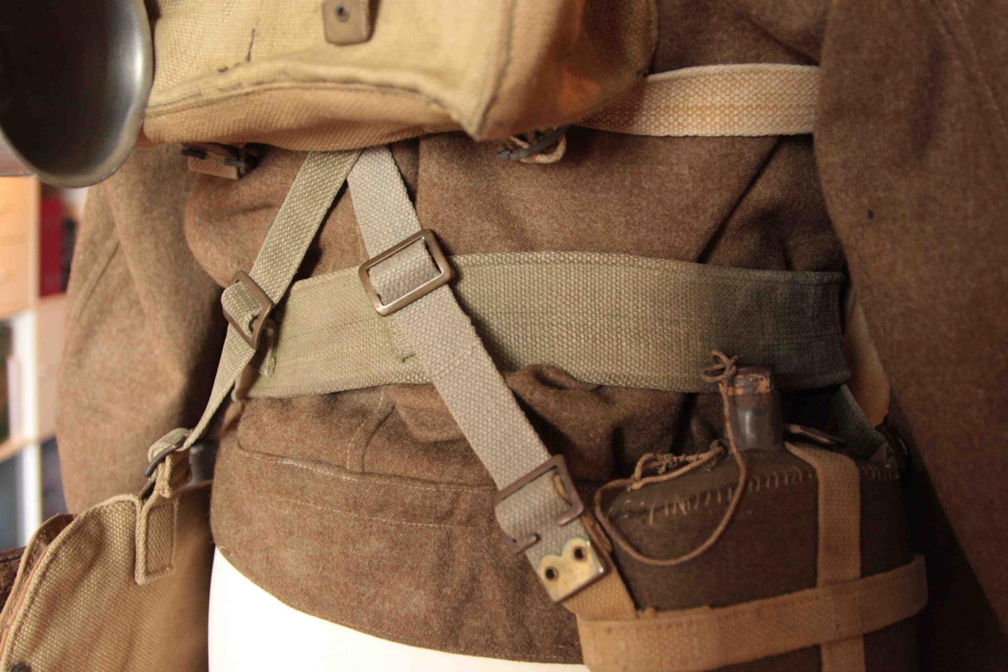 zo zit de veldfles op jouw buste, eerst door de veldfles en dan door de riem. en zo zou het moeten zijn, eerst door de riem en dan door de fles.