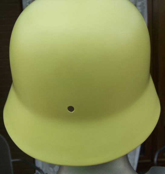 Welke kleurcode je nodig hebt weet ik niet, evenals hoe je de textuur krijgt. De eerste helmen waren natuurlijk gewoon glad gespoten, maar jij wilt er een lichte textuur in aanbrengen schijnbaar? Dit werd inderdaad gedaan ter camouflage, zodat de helm niet meer zo glom.