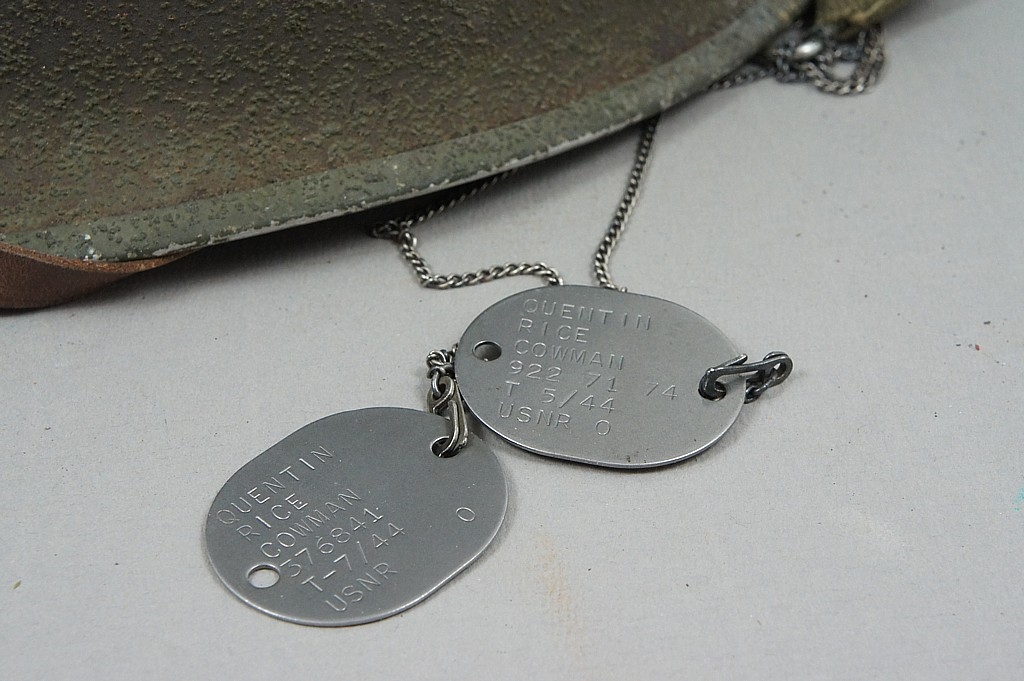 US M1 navy helmet met naam en dog tags , heb de man laten opzoeken en een dossier van 180 pagina's gekregen. Heeft op een munitie bevoorradingsboot gezeten tijdens de slag om Okinawa. Pas in 1944 in dienst gegaan.